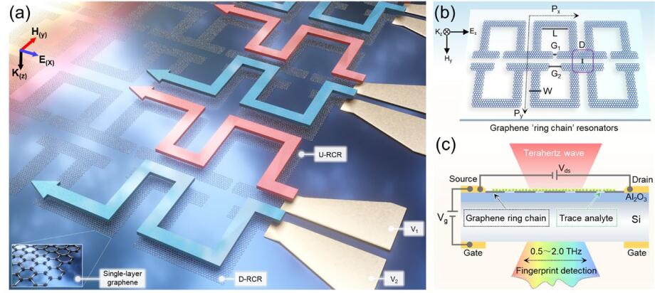 $ \sim $17.4 dB) originates from the electromagnetically induced transparency (EIT) effect excited by the metasurface, and the ideal overlap between the light field constrained by single-layer graphene (SLG) and ultra-thin analyte. Meanwhile, due to the unique nonlinear enhancement mechanism in graphene tuning, the absorption envelope distortion is inevitable. To solve this problem, a universal fingerprint spectrum inversion model is developed for the first time, and the restoration of standard fingerprints reaches Rmax2 ≥ 0.99. In addition, the asynchronous voltage tuning of the metasurface provides an opportunity for realizing the dynamic reconfiguration of EIT resonance and the slow light modulation in the broadband range. This work builds a bridge for ultra-wideband THz fingerprint sensing of trace analytes, and has potential applications in active spatial light modulators, slow light devices and dynamic imaging equipments.